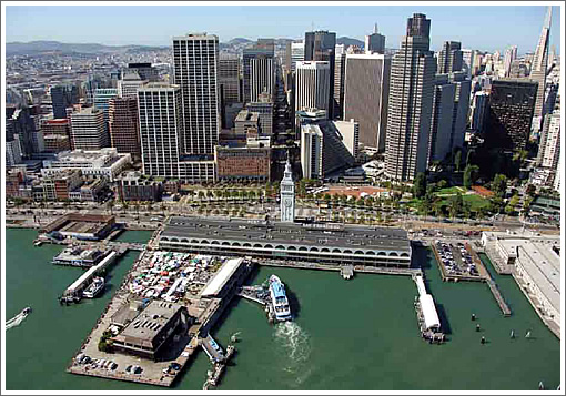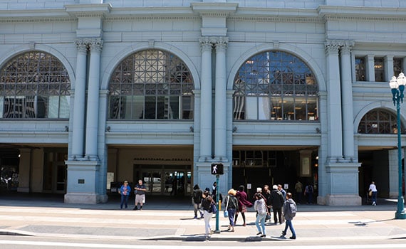 Ferry Building Embarcadero San Francisco. The most startling “early project” involves the ferry building itself. Constructed of native colusa sandstone over a steel and brick core, the ferry building stands on 111 concrete piers joined into a platform approximately 166 x 670 feet. The markets offer fruits, vegetables, herbs, flowers, … The marketplace is accessible by muni, bart and ferry boat. On saturdays, the much larger market is held both in front of the ferry building and on the rear plaza overlooking the bay.